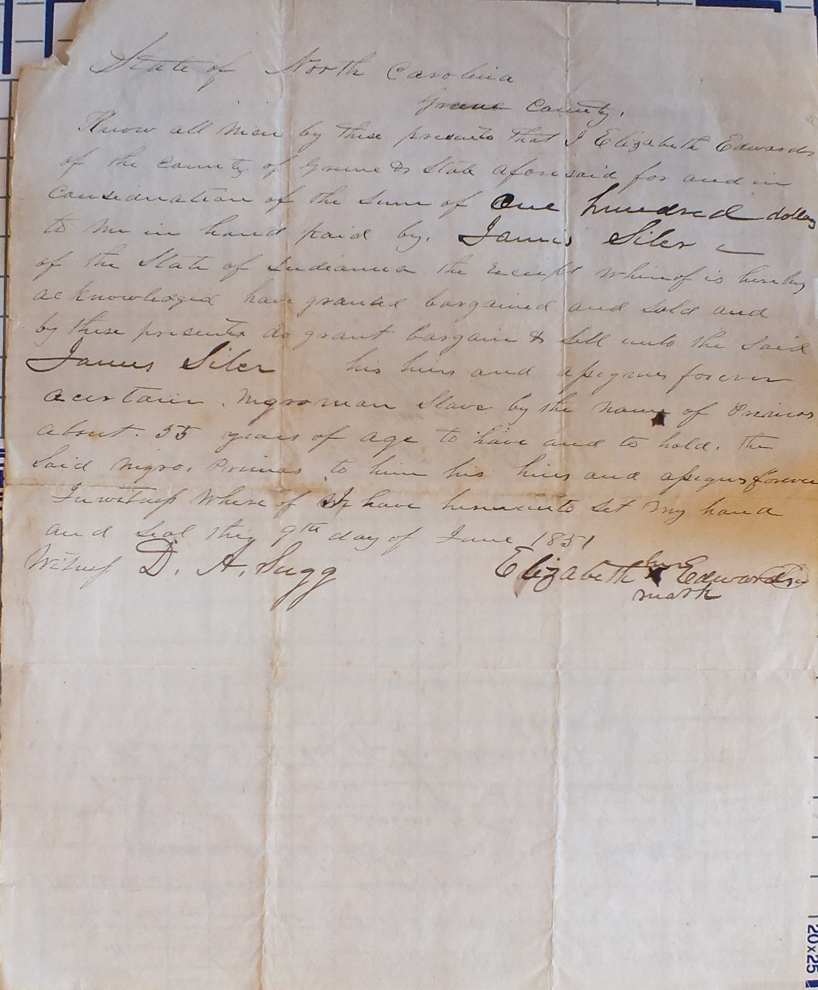 Dear Sir, Inclosed you will please find a bill of sale conveying me from Elizabeth Edwards of North Carolina to James Siler of Indiana and on the same bill under the hand of the said Siler is a writing relinquishing all claims and demands on me to Elizabeth Tyler my wife showing conclusively that the facts was known & recognized by those of that day familiar with the class With regard to living witness I don’t suppose I can produce any from they being advanced in age. I have outlived all those that was present at the time I was married according to the manor and custome of such persons in the old times and old Country which was simply to prepare a supper invite in the friends and at the proper time the groom & bride took their places at the ends of the table facing each other after supper the parties was considered duly married and was recognized by the law when not conflicting with the interest of the masters. Inclosed you please find a postage stamp with which to return the inclosed bill and I trust you will let me know immediately whether it will do any good or not if it wont do I want to know so I may look in some other direction /s/ Primus Tyler