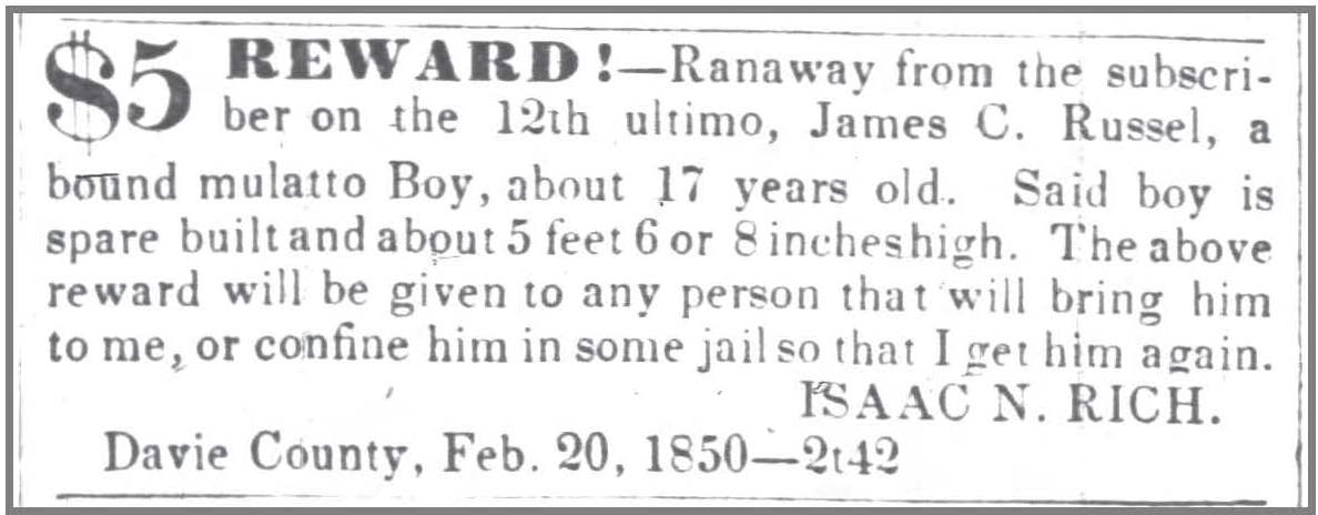 In the 1850 census of Duplin County, in the household of white farmer James Maxwell, Matilda, 7, and Sarah Rouse, 5, both mulatto. Nearby, Eliza Rouse, 27, and son Samuel, 1, both mulatto, in the household of white farmer James Tucker.