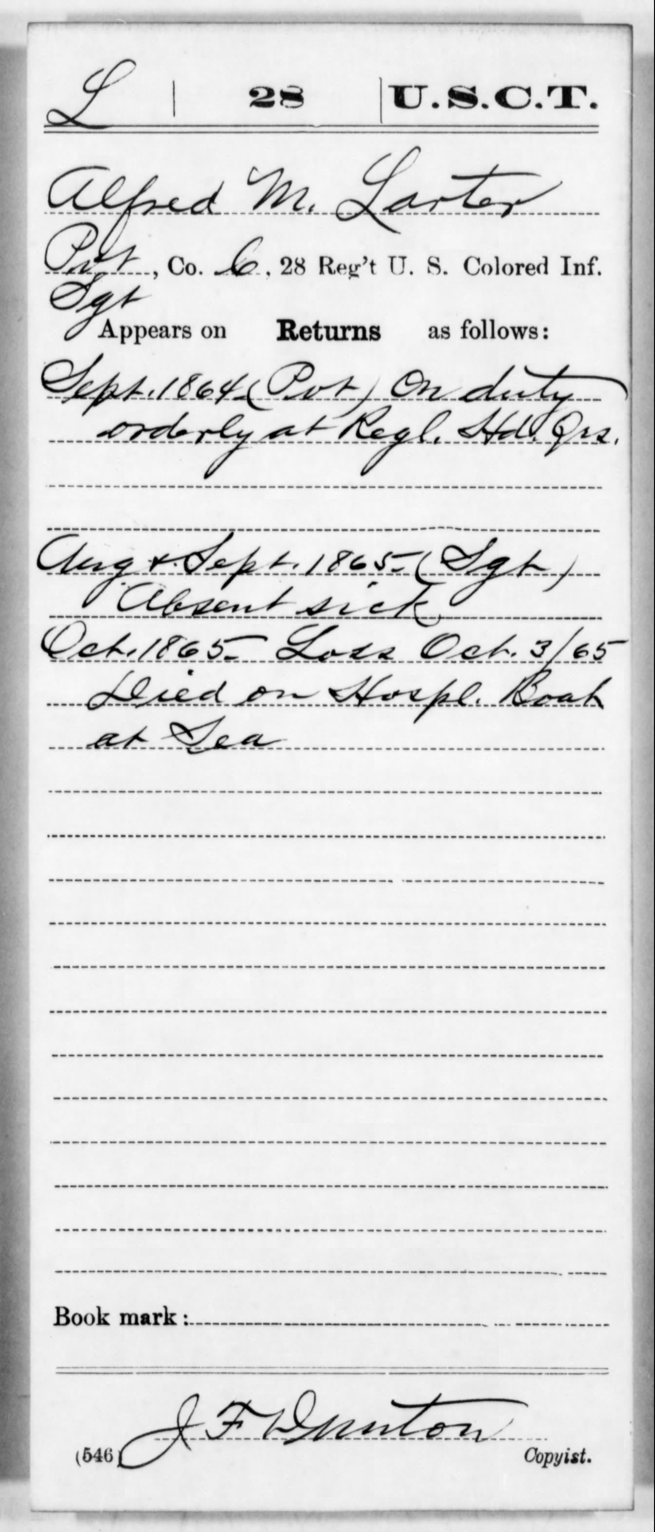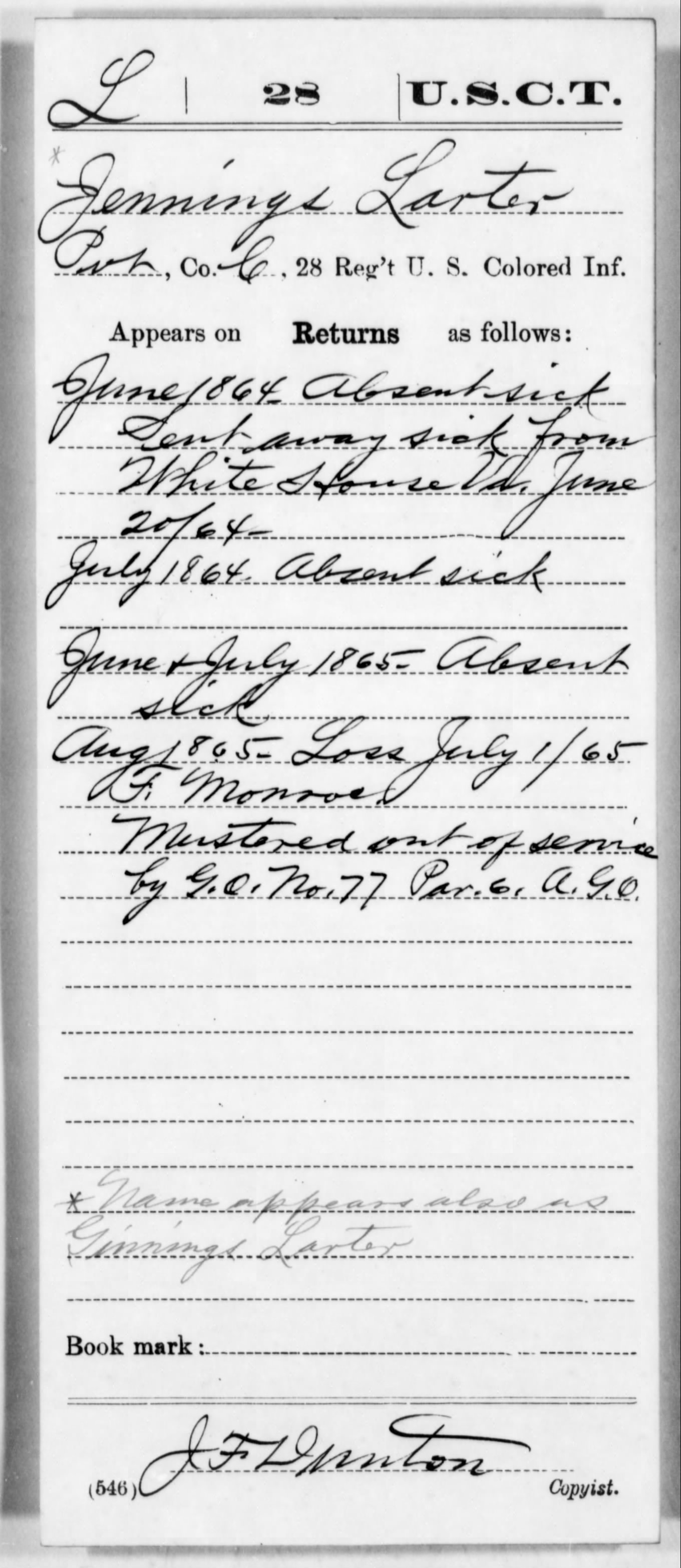 ImageImageJennings Larter and Alfred Larter were sons of Arthur and Mary Larter, who migrated from Surry County NC to Owen and Lawrence Counties, Indiana, in the early 1850s. The Twenty-eighth U. S. Colored Troops were recruited in Indiana. Six companies were organized at Indianapolis in April, 1864, and turned over to the United States as a battalion of the 28th U. S. Colored infantry.