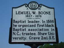 Boone sought a reconciliation between white and black Baptists and opposed a rule requiring that white churches dismiss former slaves who ran away to join the Union army and served as one of seven original trustees of Shaw University. At his death in 1878, the minutes of his association recorded that “it is safe to say that from his ordination till his death, no person in eastern North Carolina exerted a wider and more lasting influence among his people than Elder Boone.” In 1913, a monument was erected at his grave.