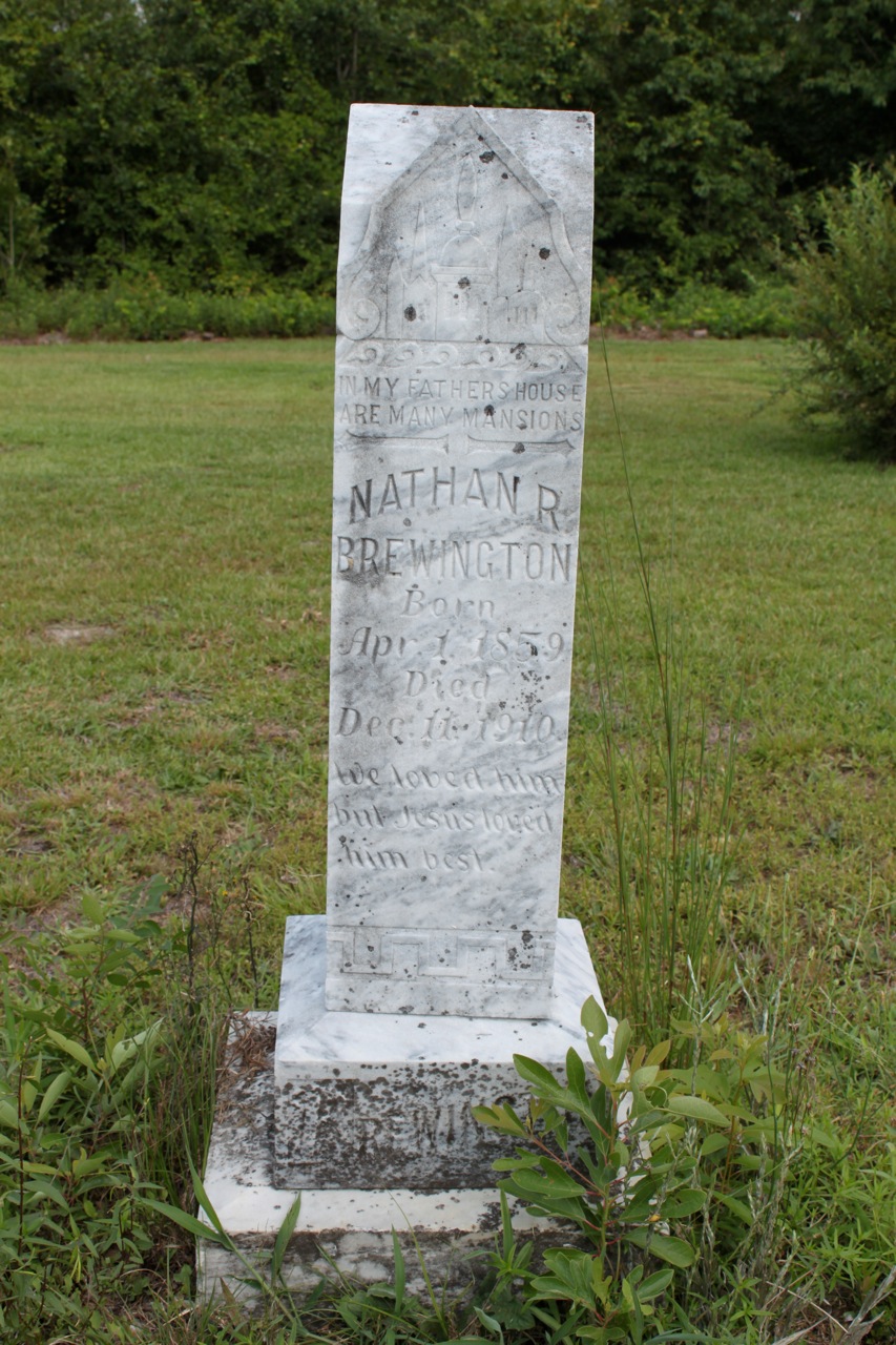 ImageNATHAN R. BREWINGTON, born 1 April 1859 in Sampson County, was the son of Raiford Brewington and Bashaba Manuel Brewington.  He married Abbie Jane Jacobs, daughter of Jesse A. Jacobs and Abigail Gilliam Jacobs, and died 11 December 1910 near Dudley, Wayne County.  He is buried in the Congregational Church cemetery there. “We loved him but Jesus loved him best.”